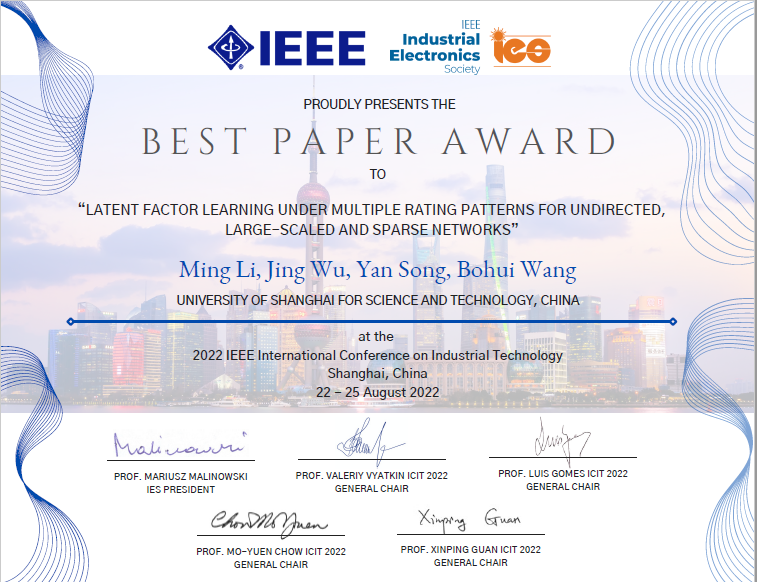 近日,新葡萄8883官网AMG控制科学与工程专业2019级李明博士在新葡萄8883官网AMG宋燕教授指导下的最新研究论文《多级评分模式下无向大规模稀疏网络的潜在因子学习》(Latent factor learning under multiple rating patterns for undirected large-scaled and sparse networks )在第23届工业技术国际会议 (The 23rd IEEE International Conference on Industrial Technology , IEEE IES ICIT 2022)上荣获最佳论文奖。该论文第一作者为博士生李明,新葡萄8883官网AMG为第一单位,宋燕教授为唯一通讯作者。