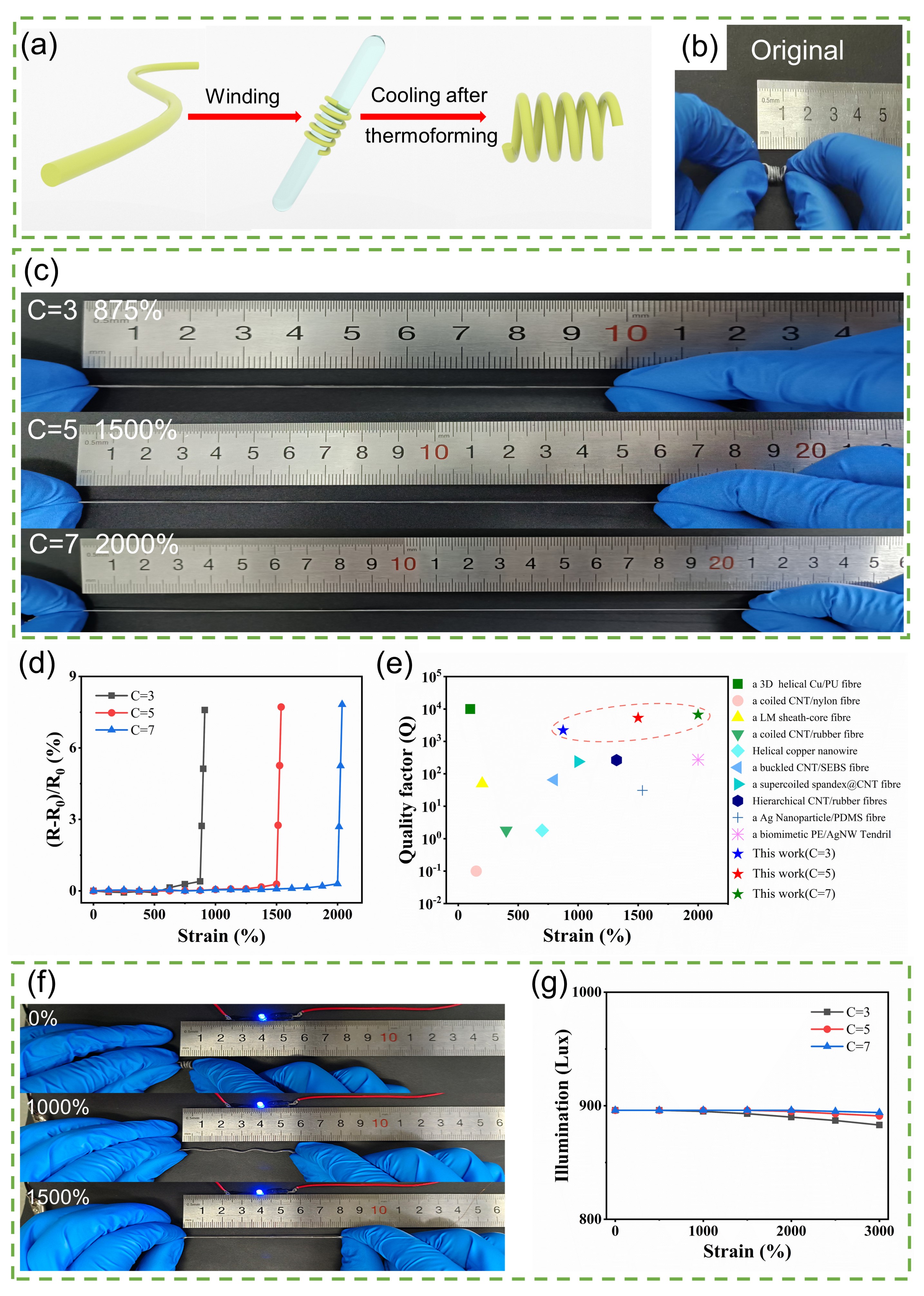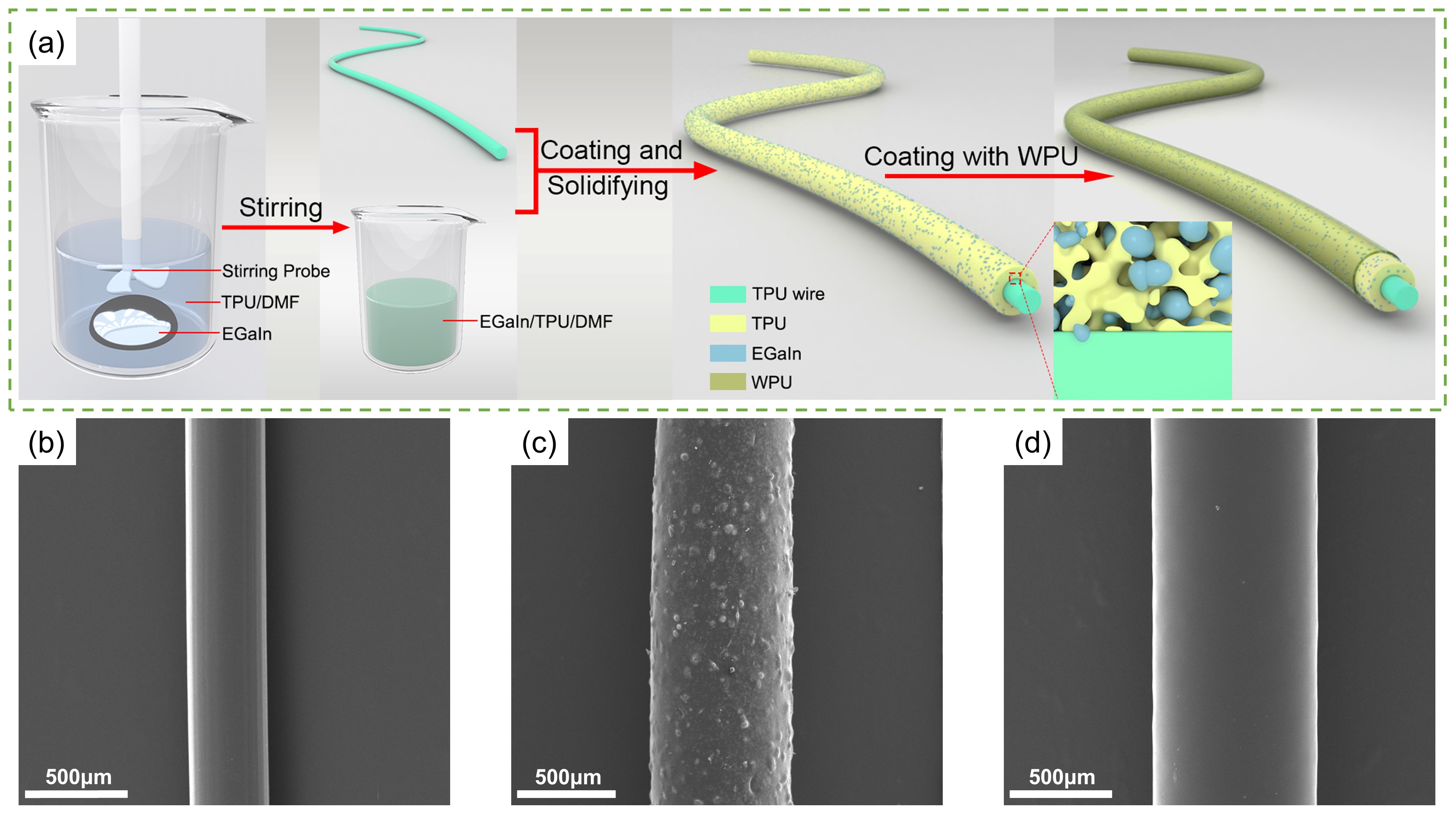 柔性电子产品在人工智能、健康监测和运动跟踪领域具有巨大的应用需求,具有优异性能的柔性导电纤维容易被编织进织物而适用于各种可穿戴设备,然而柔性导电纤维的研究面临着众多挑战,诸如制备工艺复杂、难以兼顾拉伸性和导电性、难以回收利用等问题。本研究创新性地提出在热塑性聚氨酯纤维上简单浸涂镓铟合金/聚氨酯鞘层,待其干燥后再涂覆水性聚氨酯进行封装,成功得到了一种新型的柔性导电纤维,文章对其粒径优化和导电机制进行了系统的研究。结果表明该纤维能够对不同程度、频率的拉伸应变产生持续稳定的响应;通过热塑得到的螺旋可拉伸导线能够在大应变下保持较小的电阻变化,同时兼顾拉伸性和导电性,在与诸多同类工作对比中表现出较大的拉伸范围和很高的质量因子。