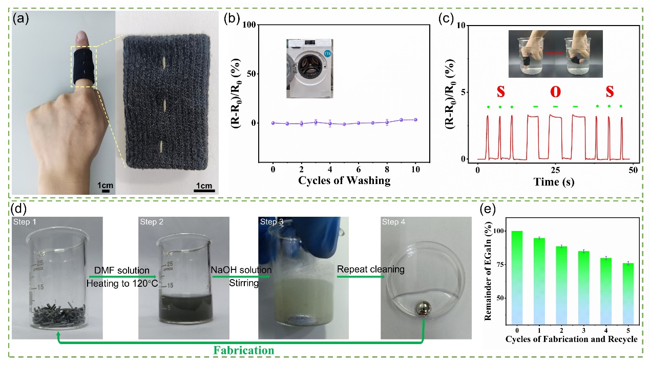 当该导电纤维被固定在身体不同部位时,它能够对手指、手腕、手肘、膝盖的弯曲程度以及喉部的微小吞咽动作实现响应并持续监测。此外,该柔性纤维还能编织进织物,由于其优异的防水性,织物可以像普通衣物一样放入洗衣机中清洗而不影响性能;当穿戴编织有该纤维的指套后,可以通过弯曲手指在水下产生SOS求救信号的摩斯密码。特别值得注意的是,纤维中最具价值的镓铟合金能以94.8%的高效率被回收以及循环利用。总之,该柔性、可回收导电纤维在人体运动监测、可拉伸导线和电子织物中具有很大的应用潜力。