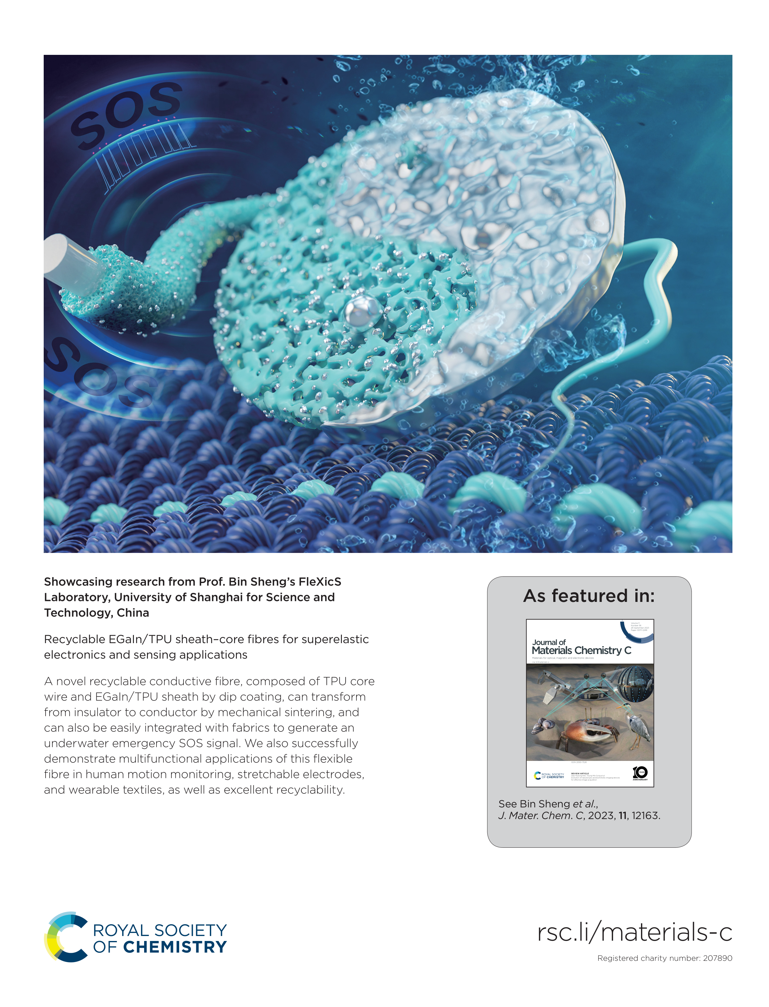 近日,新葡萄8883官网AMG2022级硕士生温子奇作为第一作者在英国皇家化学学会旗下的国际权威期刊《材料化学C》(Journal of Materials Chemistry C)发表最新研究论文,该研究成果报道了一种柔性可回收的液态金属/聚氨酯鞘-芯结构导电纤维,具有非常重要的学术意义和应用价值,并被选为当期背封面。该项工作是由温子奇同学在研一期间完成,其所在的超精密光学制造创新团队由庄松林院士、张大伟教授领衔,新葡萄8883官网AMG研究生周靖俞,赵姗姗,上海航天控制技术研究所陈上碧副主任师,张大伟教授分列第二~五作者,盛斌副教授为通讯作者。